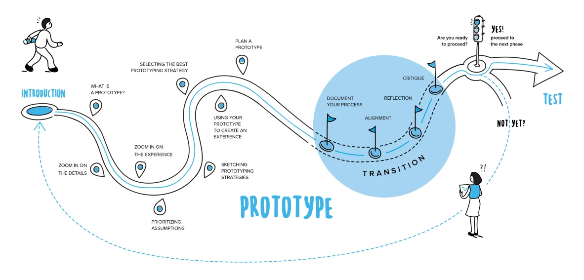 Then your design team will use rapid prototyping to make your ideas tangible and enable others to interact with the idea. The goal is to make something quickly without using a lot of resources that will allow you to get closer to knowing what will work, what won't, and why.