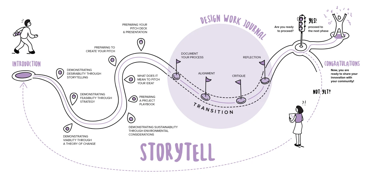 The tools in the Storytell Phase are designed to help you synthesise what you learned from your design work and prepare to share your insights and ideas in a human-centred way.