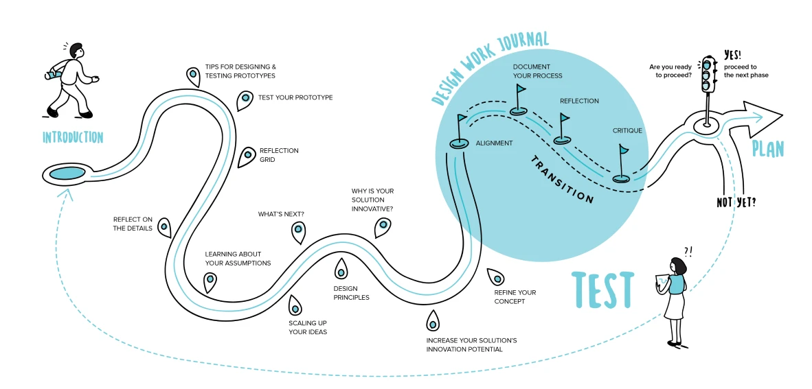 The tools in the Test Phase are designed to help you use your tangible prototypes to create experiences for stakeholders in order to test your solutions.